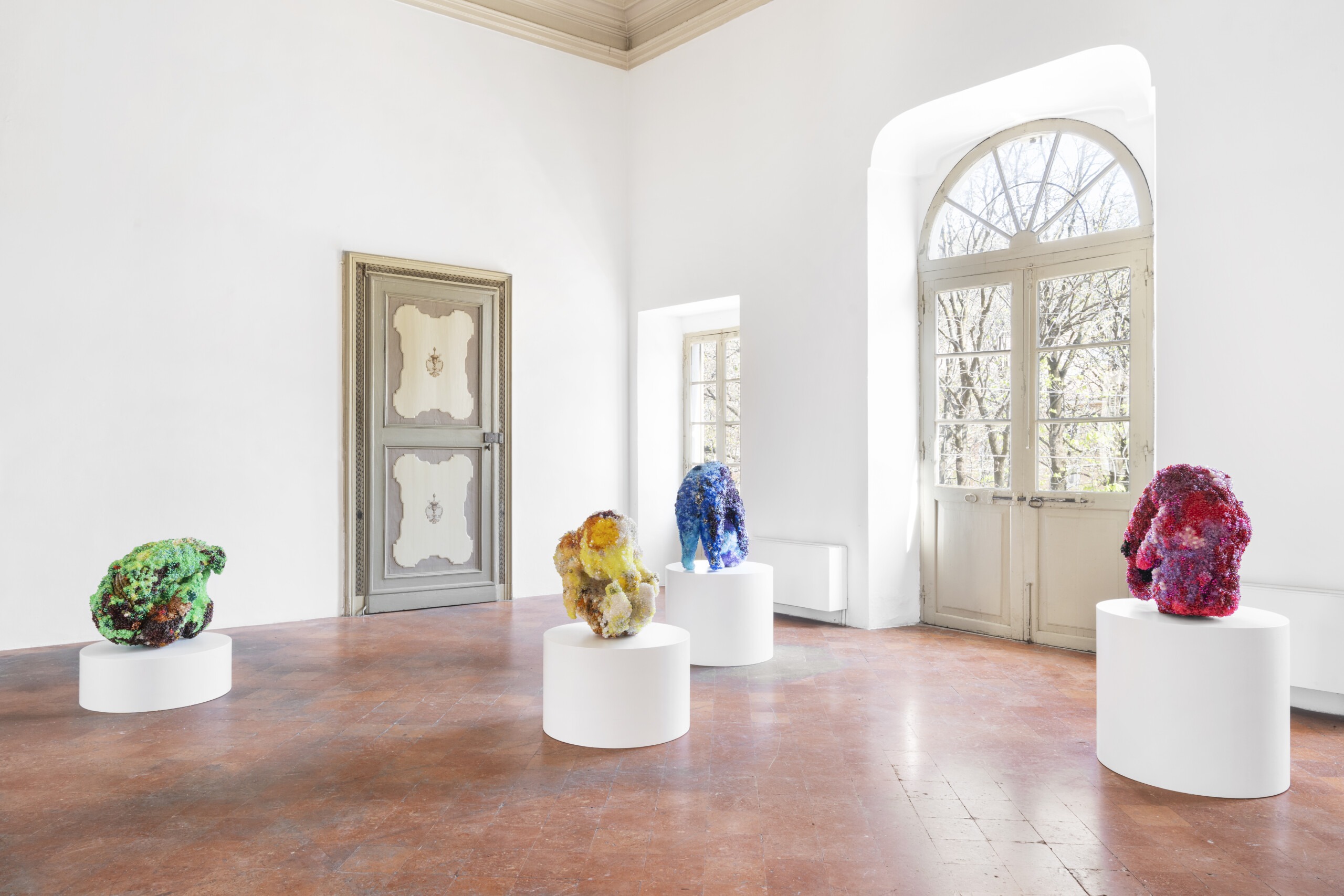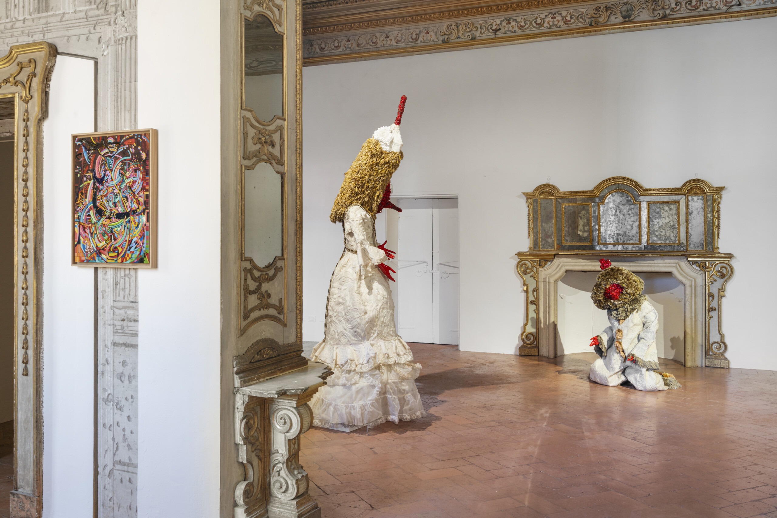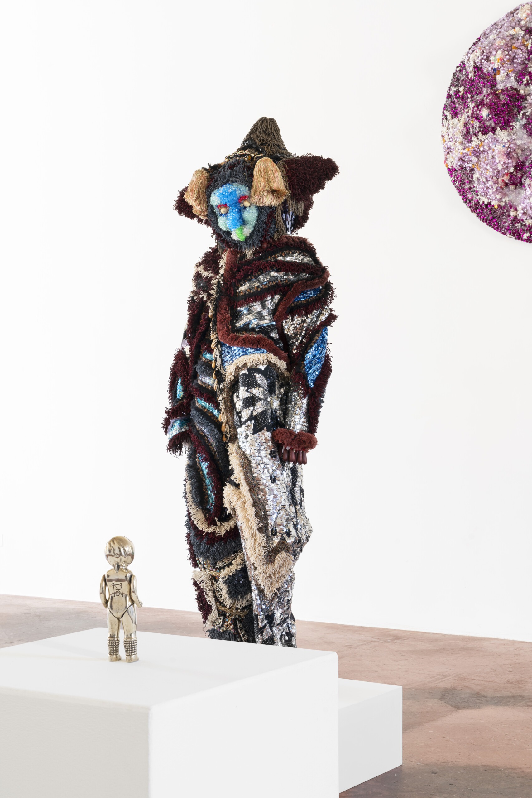 Bringing together a significant body of work from de Nieves’ most iconic series, the exhibition features narrative paintings inspired by stained-glass windows, animated performances and figurative sculptures lavishly adorned with bracelets, beads, bells, sequins and other craft materials.